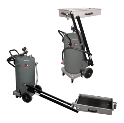 This unit can be used both under lifts and when the vehicle is on the ground. It is suitable for use with all non-corrosive liquids and is equipped with a level gauge. The container is emptied using compressed air and a tyre pressure gauge. A safety valve ensures that the pressure in the container does not exceed 0.5 bar.