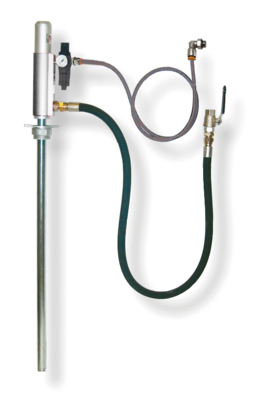 Complete air operated pump to dispense lubricating oils. Quiet and double acting operation and easy to fit to drum. Includes 2” drum adapter, 1/4” filter regulator, 1,5 m air line hose, 1,5 m hose for oil, 3/4” ball valve.