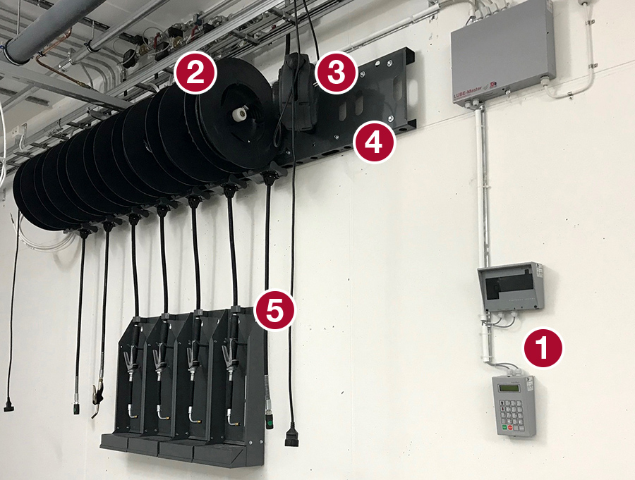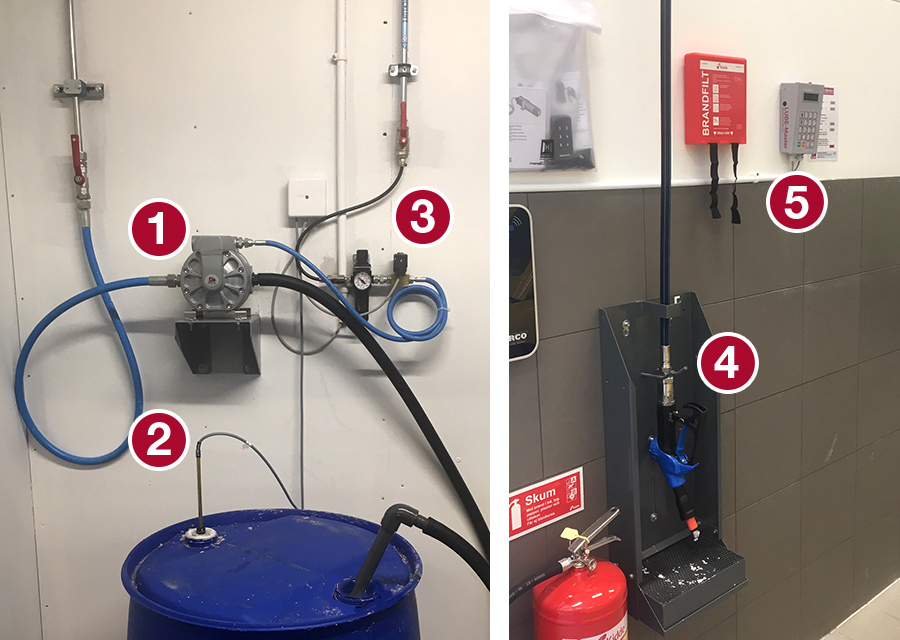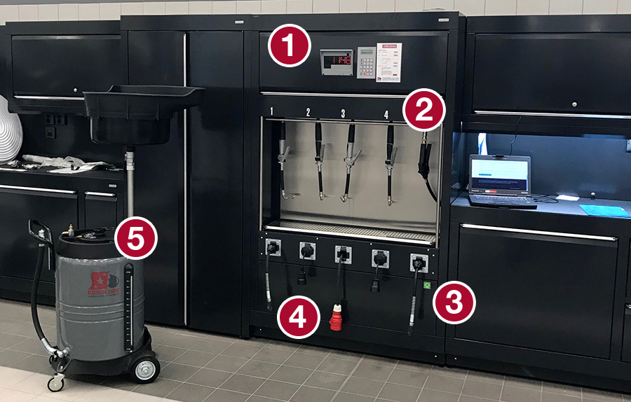 Description: Oil bar with service fluids, tap water, compressed air and 230V. LUBE-Master fluid monitoring system for registering fluid dispenses. Wall mounted hose reels using a mounting plate with pre-assembled cage nuts for easy installation. The installation also includes oil gun holsters with built-in drip tray.