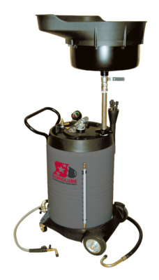 Mobile waste oil drainer used for collection of all types of oils. The drainer can be used under lifts or inside pits. Unique oversized extension and large tool tray on top of the tank improves the work space. Design and performance top of the line. Do not use with flammable or corrosive fluids. Discharge by compressed air max 0,5 bar. Includes: