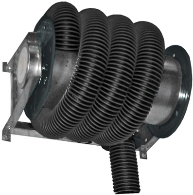 Fjäderdriven avgasslangupprullare för max. 10m Ø100 mm slang (4"). För montering i tak eller på vägg. Anslutningsstos Ø160 mm för fläkt eller centralt utsug ingår. Komplett rulle med slang (+200°C) komplettera med munstycke (ingår ej). Slangen levereras omonterad.